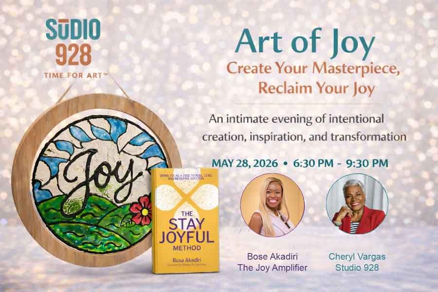 Join Bose Akadiri, author of The Stay Joyful Method, and Cheryl Vargas, Lead Artist and Creative in Chief at Studio 928, for an unforgettable evening where art, intention, and strategy collide. In this exclusive collaboration at Studio 928, you’ll craft your own faux‑stained glass piece while discovering how joy becomes your greatest resource in life.