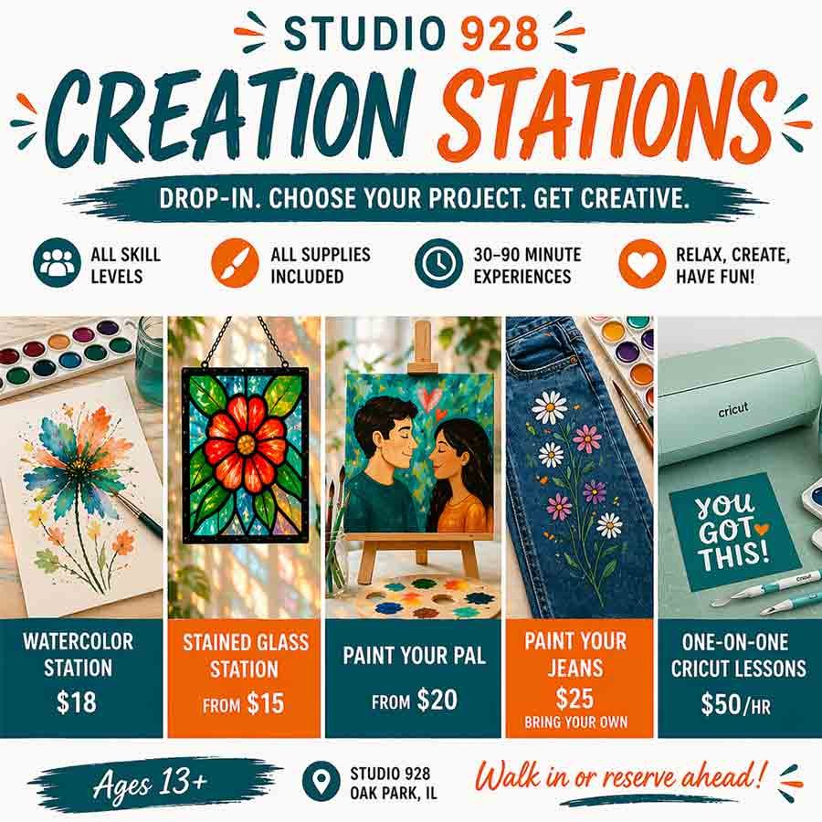 Looking for a drop-in art class in Oak Park? Studio 928’s Creation Stations let you choose your project and create on your schedule. From watercolor and faux stained glass to custom painting and Cricut lessons, our guided experiences are beginner-friendly and designed for relaxation and creativity.